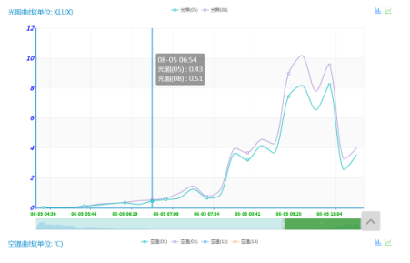 11、在線監測各環境因素參數的表現形式:A、清單明細式,可以直觀地查看各個環境因素參數在某個時間點的監測數據。B、曲線走勢圖顯示方式,C、立柱式走勢顯示等。